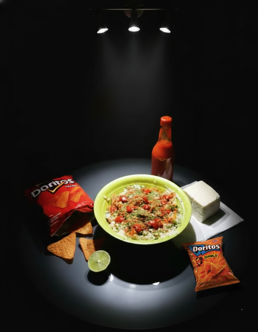 🌽 La Base Legendaria: Maíz tierno y jugoso con un toque aromático de epazote fresco. 🧀 EL MURO DE QUESO: Sumérgete en la cremosidad de la mayonesa, la riqueza del queso amarillo, la intensidad del cheddar, la sofisticación del añejo y el picante inconfundible del jalapeño. ¡Una sinfonía de lácteos! 🔥 TU PROTAGONISTA CROCANTE: ¿Nacho, Incógnita, Diablo, Tostitos Flamin’ Hot o Pizzerola? ¡TÚ ELIGES EL CRUJIDO PERFECTO! Desmenuza tu Dorito favorito y llévate el sabor al siguiente nivel. 🌶️ EL ÚLTIMO DESAFÍO: Y para coronar tu obra maestra, elige tu nivel de picante. ¿Audaz? ¿Extremo? ¡Tú decides!